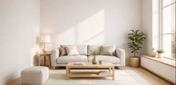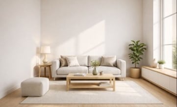 Light wood flooring, white or pale walls, cozy fabric sofa, simple functional furniture, indoor plants, soft textiles, bright natural daylight, warm and inviting Nordic aesthetic.