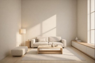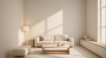 Clean-lined, low-profile furniture, matte finishes, neutral palette of white, light beige, and soft gray, minimal decor, natural wood accents, uncluttered surfaces, soft daylight, calm and airy atmosphere.Luxury Contemporary